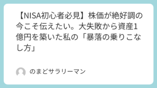 サイドFIRE 【NISA初心者必見】株価が絶好調の今こそ伝えたい。大失敗から資産1億円を築いた私の「暴落の乗りこなし方」 日経平均やアメリカの株価が、毎日すごい勢いで上がっていますね! まさに世界中が「お祭りムード」です。最近NISAを始めた方は、アプリを開くたびに資産が増えていて、「投資って、すごく楽しい!」と感じている頃ではないでしょうか。こんな風にうまく... 2025.09.17 サイドFIRE