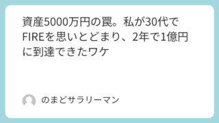 サイドFIRE 資産5000万円の罠。私が30代でFIREを思いとどまり、2年で1億円に到達できたワケ 「資産5000万円」——。この響きには、一種の魔法がありますよね。コツコツと働き、節約と投資を重ねてようやくたどり着く、大きな大きな節目です。「ここまで頑張ったんだ。もう会社に縛られず、自由に生きていけるんじゃないか?」もしあなたが今、そん... 2025.09.18 サイドFIRE